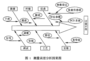 由于工藝的改造,問題相對錯綜復(fù)雜,從設(shè)計、安裝、運(yùn)行環(huán)境中都存在不同程度的改變,許多問題互相牽連,甚至一種問題是由不同的幾個原因共同造成的,再加上有些問題的解決需等待一定的工藝運(yùn)行時機(jī),故給問題的解決帶來了*大的困難。現(xiàn)將影響測量誤差因素一一列舉(見圖1)。
