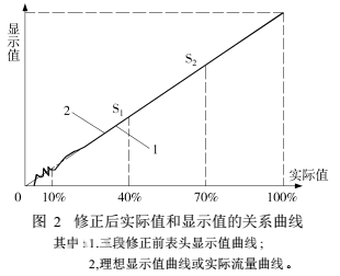 如上所述的基本策略實際上就是修正了40%以下的流量系數和修正了 70%以上的流量系數。用圖1表示就是改變了40%以下的流量指示值曲線的斜率和70%以上的流量指示值曲線的斜率。