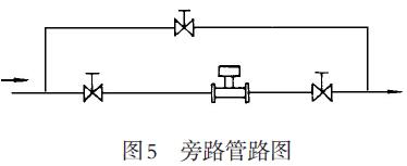 為了方便地檢查和清洗流量計(漩渦發生體),安裝如圖5所示的旁通管道。對于初次投運或管線設備檢修后,開車時應先使工藝介質走旁路24小時,待介質干凈時開表,以防變送器被異物阻塞或變送探測器被損壞。