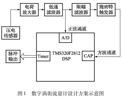 本文設計的基于 TMS320F2812 DSP 的數字飽和蒸汽計量表的信號處理系統由前置放大電路和數字信號處理電路兩部分組成。本文選用的前置放大電路即為目前被廣泛應用的普通飽和蒸汽計量表的前置放大電路,主要由電荷放大電路、低通濾波電路、限幅濾波電路和施密特觸發電路組成; 對于經壓電傳感器測得的渦街信號采用了頻域分析和時域分析相結合的方式,即由前置放大電路和數字信號處理電路相配合。時域分析通道利用 DSP 事件管理器的捕獲模塊,對前置放大電路輸出的方波進行頻率計算,然后再由 DSP 事件管理器通用定時器的比較輸出模塊進行脈沖輸出。頻域分析通道即 DSP對低通濾波電路輸出的疊加了許多噪聲的正弦信號進行 A/D 采樣,再利用 DSP 對 A/D 采樣的結果進行頻譜分析,從而得出此時渦街信號的頻率,*后由 DSP 通用定時器的比較輸出模塊進行脈沖輸出。系統設計方案示意圖如圖 1 所示。