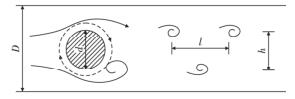 渦街流量表是由漩渦發生體、頻率檢測器和信號轉換器等環節組成,輸出 4 ~ 20 mADC 信號或脈沖電壓信號。其測量原理是在流動的流體中的垂直流動方向安放 1 根或多根非流體型阻流體,在一定的流量范圍內,流體在阻流體兩側交替地分離、釋放出 2 串頻率正比于管道內的平均流速、規則的、不對稱有規律的交替漩渦列,如圖 1 所示,且兩側漩渦旋轉方向相反 。采用檢測元件測出漩渦頻率就可以推算出流體的流量。