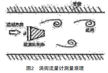 在流體中設置旋渦發生體,則從旋渦兩側交替產生有規則的旋渦,這種旋渦稱為卡門旋渦,如圖2所示,旋渦列在旋渦發生體下游非對稱地排列。旋渦流量計是根據卡門渦街原理測量氣體、蒸汽或液體的體積流量、標況的體積流量或質量流量的體積流量計。并可作為流量變送器應用與自動化控制系統中。