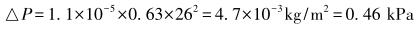 式中,△P為壓力損失,kg/m2;ρ為流體密度,kg/m3;V為流速,m/s。