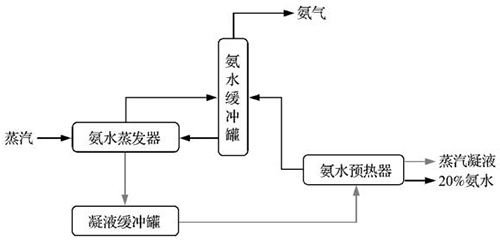 智能渦街流量計器為固定管板的立式熱虹吸再沸騰器,這種形式的換熱器造價低、占地面積小、傳熱效率高。智能渦街流量計器與氨水緩沖罐有安裝高度要求,氨水緩沖罐中的液體靠靜壓頭進入智能渦街流量計器,被蒸汽加熱部分氣化后進入氨水緩沖罐中進行氣液分離。智能渦街流量計器采用0.8MPa低壓過熱蒸汽加熱,加熱后的蒸汽變為蒸汽凝結水,靠液位差進入凝液緩沖罐。加熱蒸汽的流量根據氨水緩沖罐的液位通過DCS自動控制。