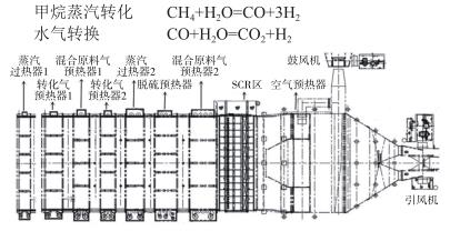 壓縮空氣流量計是一個的矩形絕熱結構,包括輻射段、對流段和鼓 / 引風機系統等。輻射段包含裝有催化劑的垂直壓縮空氣流量計爐管 ;對流段采用水平“一”字型布置結構,沿煙道氣流方向分別串聯8個對流段換熱模塊(見圖1)。煙氣進每段盤管的溫度分別是 ~1 050℃、~956℃、~887℃、~801℃、~685℃、~550℃、~542℃、409℃,好終溫度約為137℃的煙氣經引風機從煙囪排入大氣。