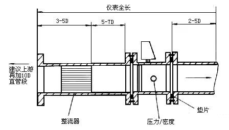 成套安裝,包括前后直管段,流動調整器等是保證獲得高精確度測量的一個措施,特別這些裝配在制造廠進行更能保證安裝的質量,圖21所示為一安裝實例。
