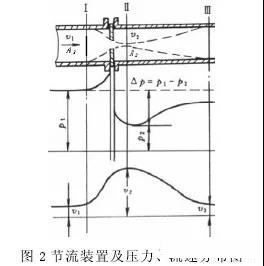 在徑向壓差的作用下,流體產生徑向加速度,從而使靠近管壁處的流體質點的流動方向傾斜于管道中心軸線,出現縮脈現象。由于受到慣性作用,流速的*小截面并不在節流裝置的孔口處,而是經過節流裝置之后仍繼續收縮,到截面Ⅱ處流速達到*小,此時流速大,即v2,之后流速又逐漸擴大,至截面Ⅲ后完全恢復,流速逐漸降到原值,即v3=v1。