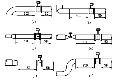 (3) 對于有變徑要求的工藝管線 , 前后直管段的長度分別保證不小于 10 D 和 5 D 就可以了 ; 如果必須在流量計的上游側選用閘閥 , 那么前直管段的長度不應小于 40 D。
