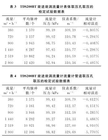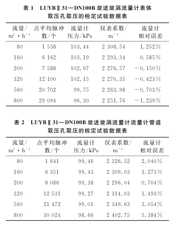 以使用廣泛的DN100B甲烷計量表為例,系統運行時間為60s,標準裝置的滯止平均溫度為28.9℃,空間平均濕度為30%,流量計的平均溫度為28.3℃,在表體取壓孔取壓和管道取壓孔取壓的流量計檢定試驗數據分別如表1、2所示。